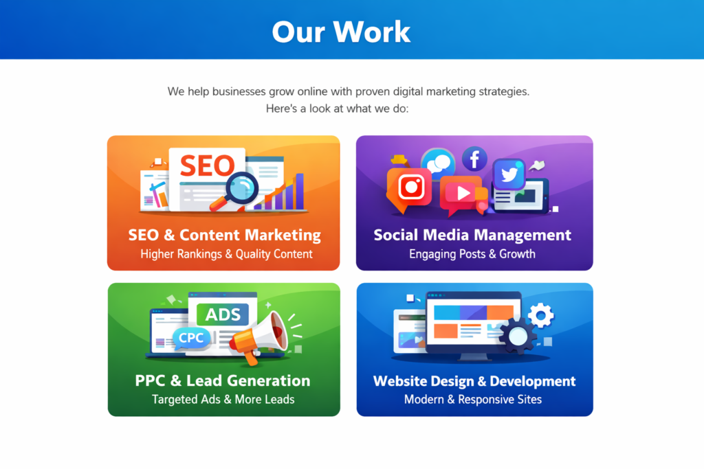 Our work includes search engine optimization (SEO) to improve your website’s visibility on Google, performance-driven paid advertising campaigns, and engaging social media marketing that builds trust and brand awareness. We also create high-quality content that educates, engages, and converts your audience.